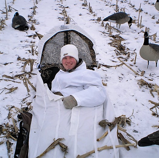 Due to a NEW state-of-the-art blind concept by Avian-X called the “A-Frame”, we now have a secret weapon against the geese. The new blinds were tested thoroughly over the past few seasons on both early and late season Ducks, Canada Geese, Ducks and even on Snow Geese with unbelievable results. It’s something new for the birds and the well camouflaged blinds don’t seem to bother them at all as often decoy to them without any suspicion or hesitation. These blinds are awesome to hunt out of if you enjoy shooting geese Up Close as most of the shooting is done at point blank range while you are in a standing position to shoot with both feet on the ground. The A-Frame’s weightless portability, low profile, natural appearance (allowing it to blend in perfectly with any environment) and excellent concealment abilities allows us to set up in the middle of vast harvested fields or using edge cover as a backdrop.